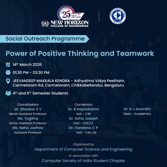 EXTENSION PROGRAM Social Outreach Program -Power of Positive Thinking and Teamwork The Department of Computer Science and Engineering organised a Social Outreach Programme on “Power of Positive Thinking and Teamwork” on 14th March 2026 at Jeevandeep Makkala Kendra, Adhyatma Vidya Peetham, Carmelaram Road, Bengaluru. The programme aimed to create awareness among students about the importance […]