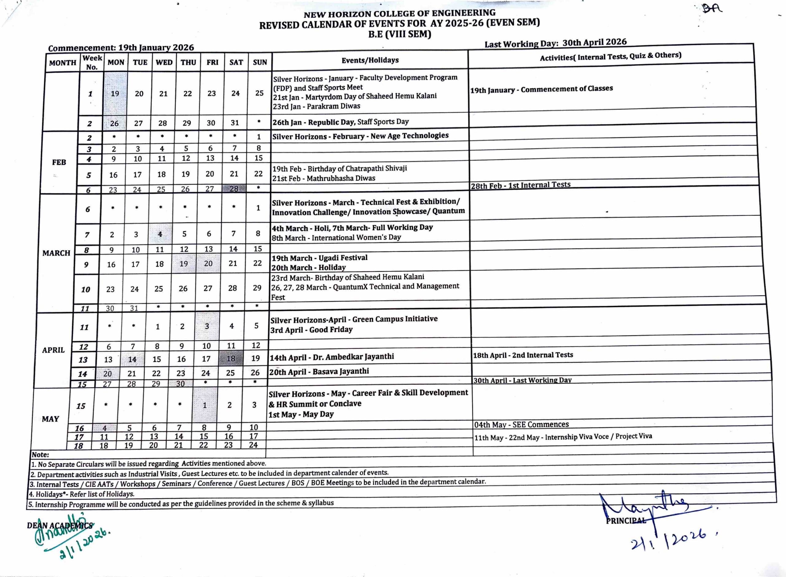 B.E. 8TH SEM Calendar of Events